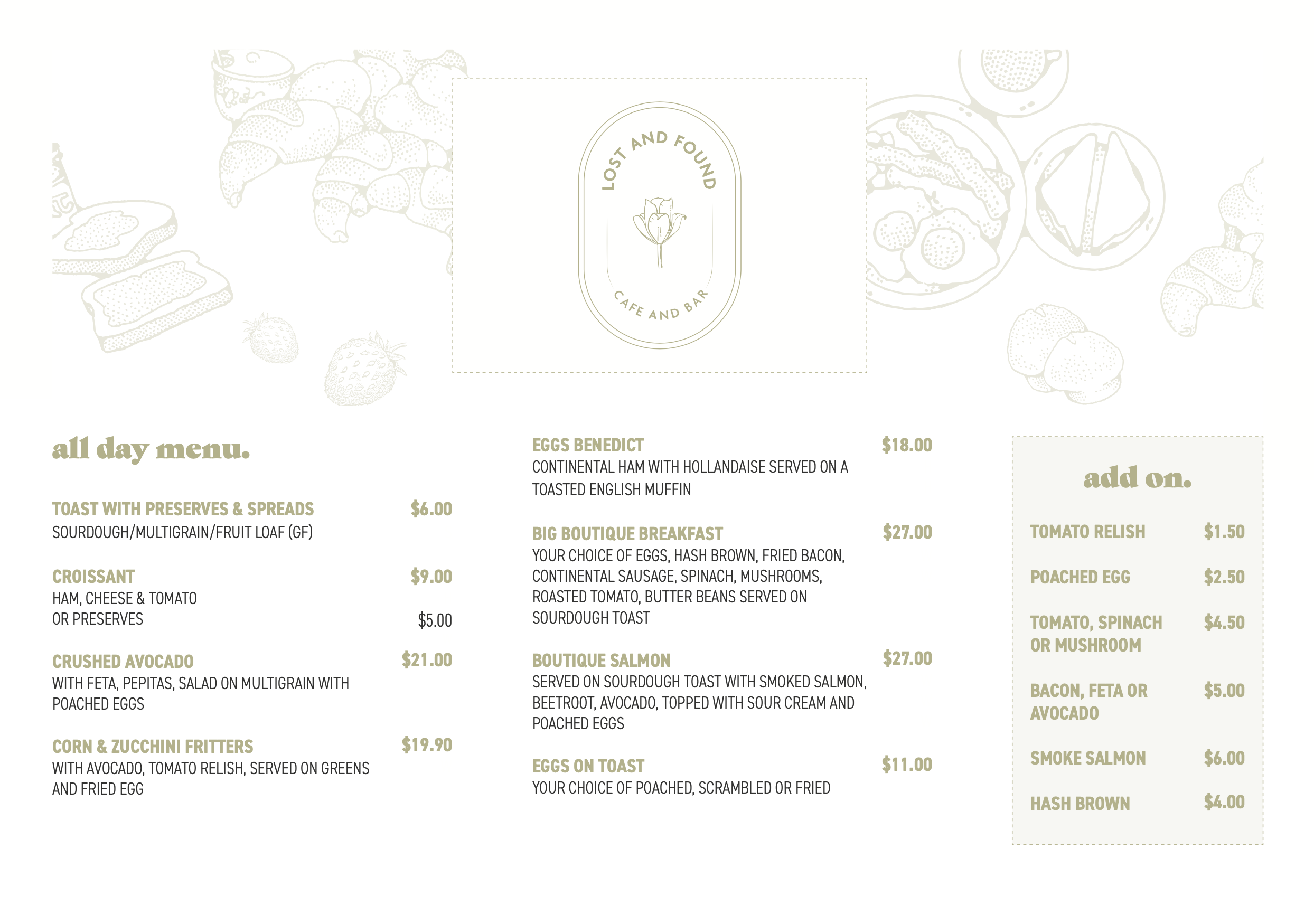 Lost & Found - Cafe and Bar is a local cafe located in Melbourne’s west. Located along the Maribyrnong river, the brand was to reflect the nature that surrounds it. The brand required a logo and colour palette that could be used on signage, uniforms, takeaway packaging and other miscellaneous items used throughout the cafe.